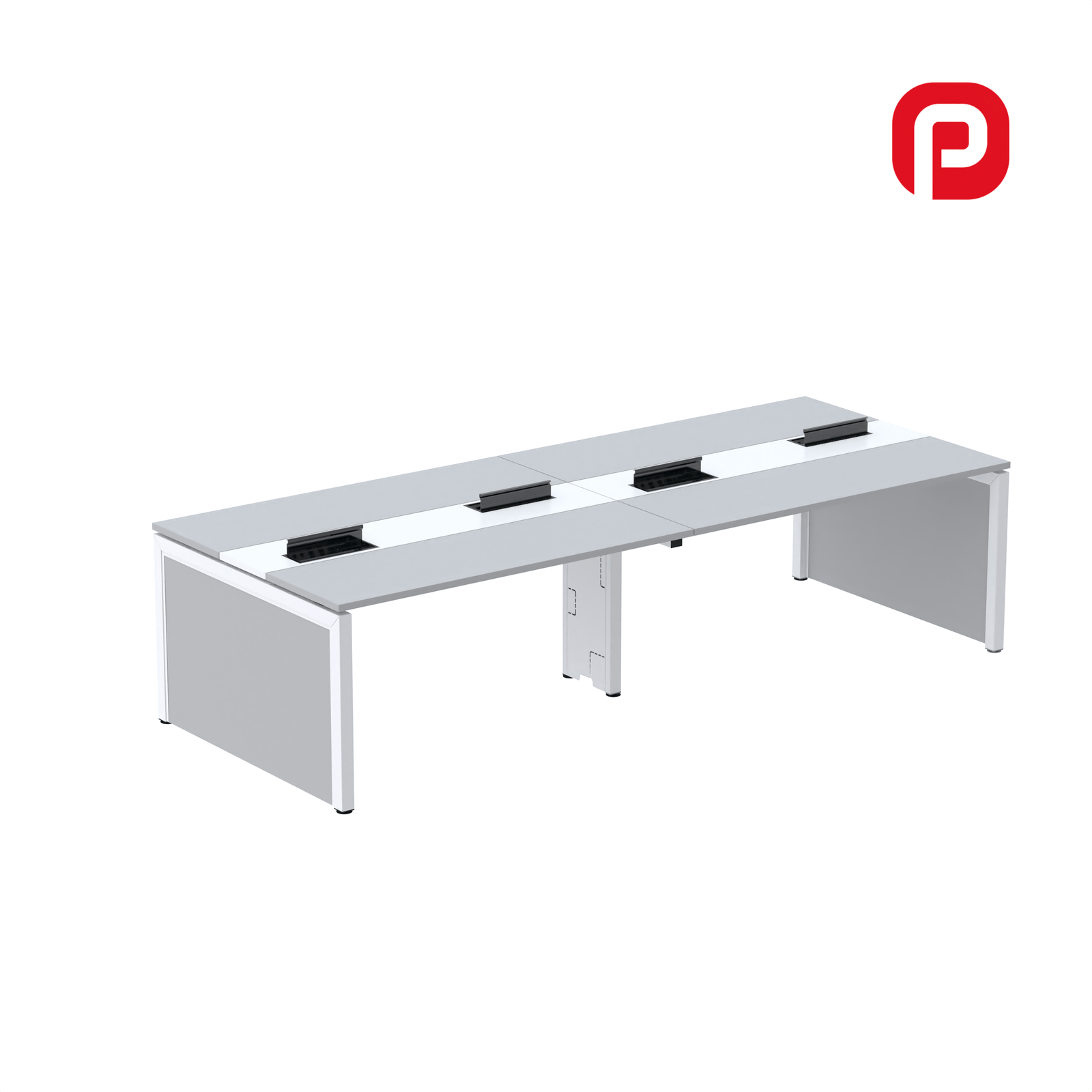 O pé central em aço é projetado para passagem de fiação interna. O produto inclui uma calha passa-fio em chapa de aço e uma caixa de tomada em chapa de aço com tampa em ABS (Acrilonitrila Butadieno Estireno) para o encaixe de dispositivos (tomadas e conectores não inclusos).