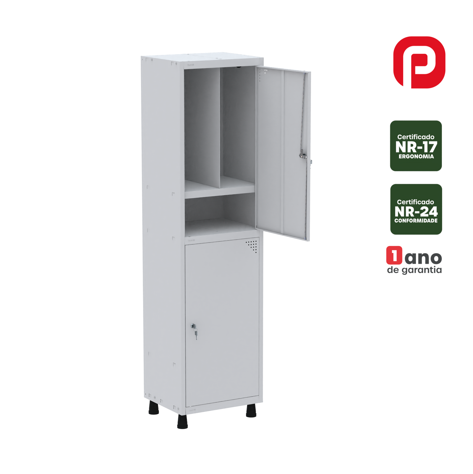 O Roupeiro de Aço Pandin 2 Portas com Divisórias Internas é a solução ideal para vestiários e ambientes corporativos que exigem organização, segurança e durabilidade. Desenvolvido em conformidade com as normas NR-18 e NR-24, oferece um design inteligente totalmente montável através de travas invertidas tipo “unha de gato”, sem necessidade de parafusos na estrutura principal.