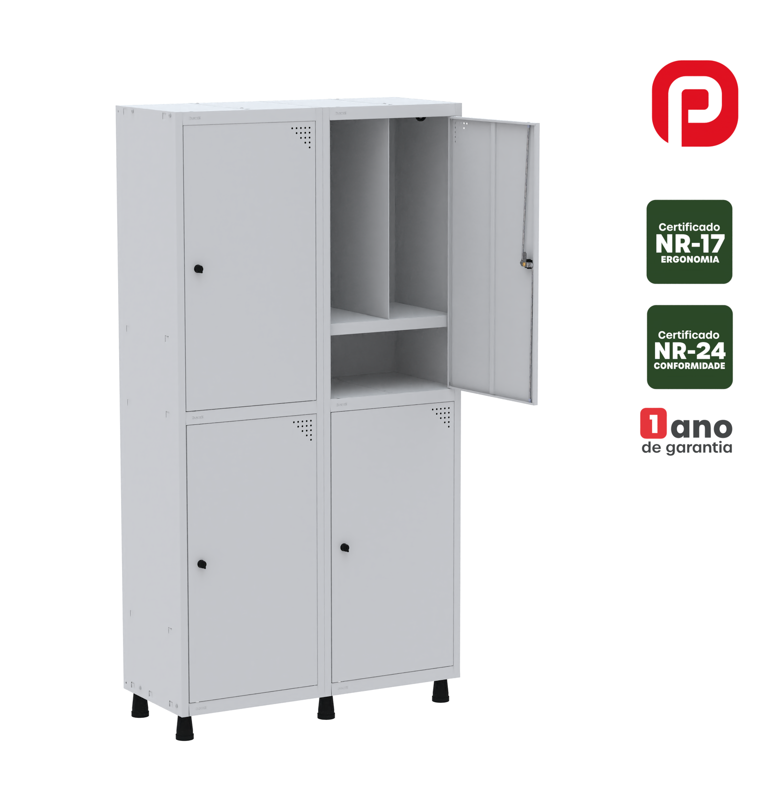 Organize vestiários e ambientes corporativos com segurança e praticidade utilizando o Roupeiro de Aço 4 Portas. Desenvolvido em conformidade com as normas NR-18 e NR-24, este móvel oferece robustez para o uso diário intenso e excelente durabilidade.
